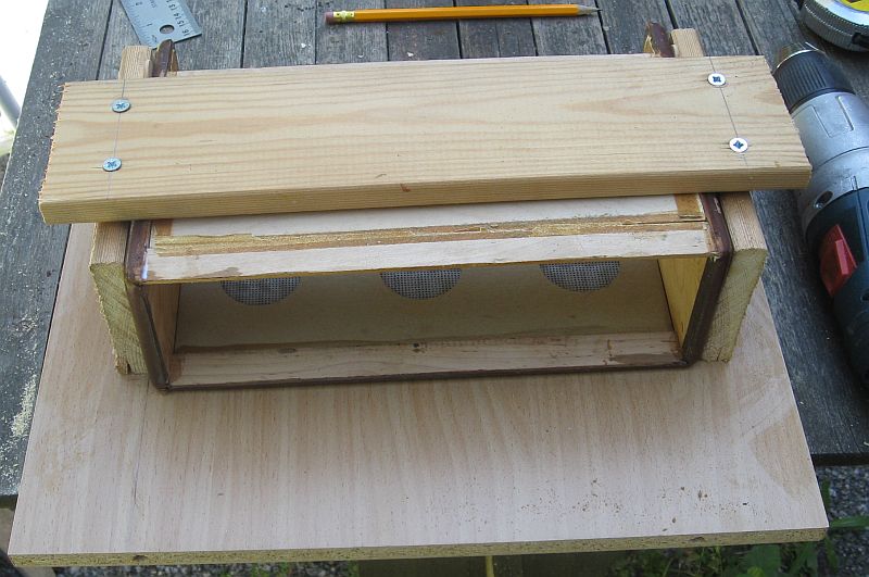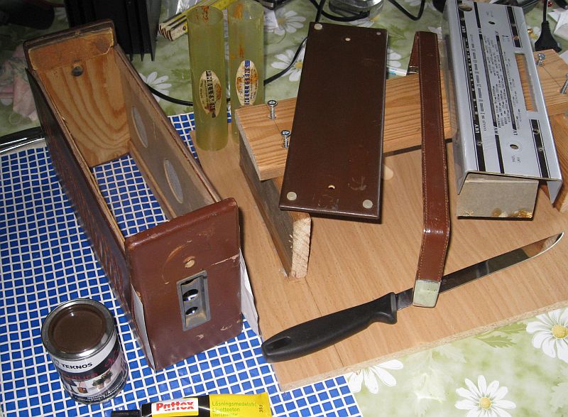 Väsäsin liimaus-kehikon (kuka siellä hymyilee ?) vanhasta hyllyn-levystä ja laudanpätkästä. Sahasin radion päätyjen mittaiset laudan pätkät ja liimalla ja ruuveilla kiinnitin ne hyllyn-levyyn millin pari lyhyemmälle etäisyydelle kun radion pituus päätykappaleineen oli suorakulmalla tarkistaen. Radion etu ja takalevyssä on listat jotka osuvat päädyissä oleviin koloihin. Laitoin niihin liimaa ja painoin käsin yhteen, sen jälkeen painoin radiokehikon liimaus-kehikkoon. Liimaus-kehikossa pystylautojen yli kiinnitin pidemmän laudan lukitukseksi. Viritys ei ole nätti mutta taatusti kappaleet ei liiku liiman kuivumisen aikana. Syy moiseen oli että liimaus-pinnat oli erittäin pienet, 4X20 mm lisojen päät. Alla kuva hökötyksestä. En irroittanut päätyjen nahkoja ja takalevyn koska ne oli hyvin kiinni. Takalevyn nahasta aukaisin liimauksen toisesta päästä jotta saan pujotettua suoja paperin suojamaan alumiini verkkoa nahan maalauksen ajaksi.