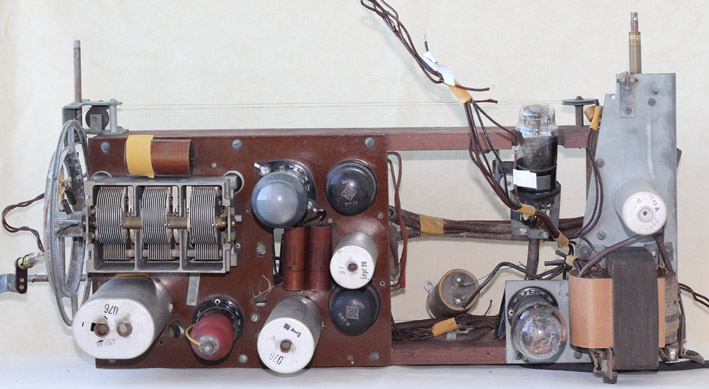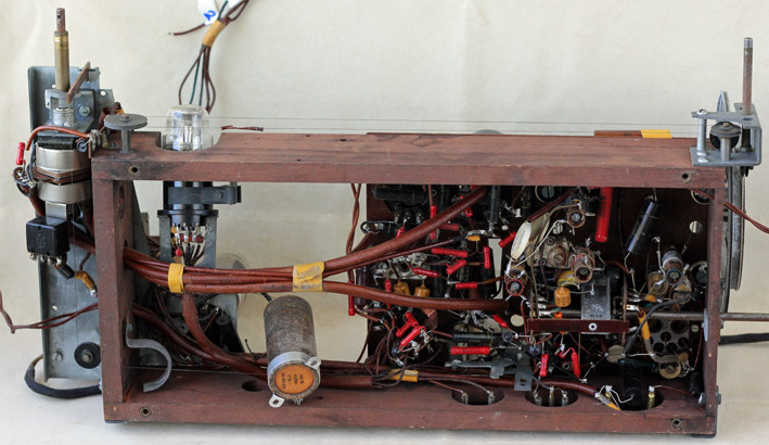 Tällaiselta näyttää koneisto alapuolelta. Suunnilleen keskellä näkyvä elektrolyytikondensaattori on joskus tehdyn korjauksen jäljiltä. Alkuperäisen panta näkyy puukehyksessä vasemmalla.