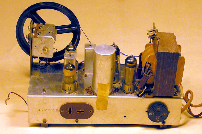 Ohessa kuva koneistosta. Kaipaan kuvia radion etupuolelta, takalevystä ja radiosta ilman takalevyä niin, että koneiston sijoitus koteloon näkyy sekä asteikosta.