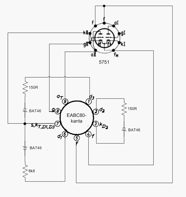 Kokeilin tätä korvikepalikkaa nyt Salora 810 V/B:ssä. Tämän kanssa tuli sellainen ongelma, että tuo alkoi värähdellä muutaman kHz:n taajuudella joka kuului ikävänä vinkunana. Tämä ei tullut ilmi jos volyymin sääti ihan hiljaiseksi, mutta volyymipotikkaa kääntäessä vinkuna alkoi. Eli ilmeisesti tuo vika on tuossa triodiosuudessa. Kokeilin sekä 5751:llä että ECC83:lla ja sama vika molempien kanssa. EABC80:n ja 6T8A:n kanssa ongelmaa ei tuolla radiolla ollut.