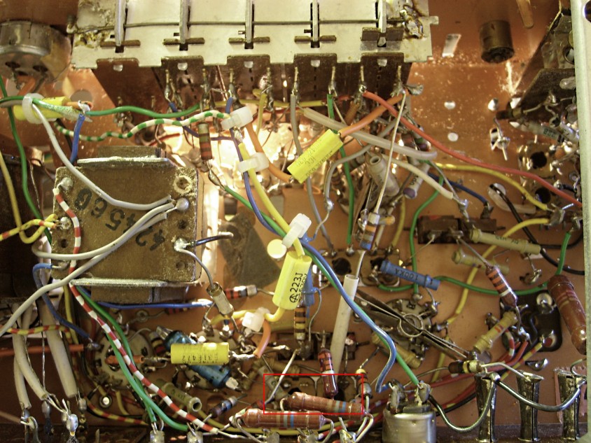 Tässä vielä muutama kuva radiosta. Konepellin alta otetusta kuvasta pätkinyt vt-muuntaja on merkitty punaisella.