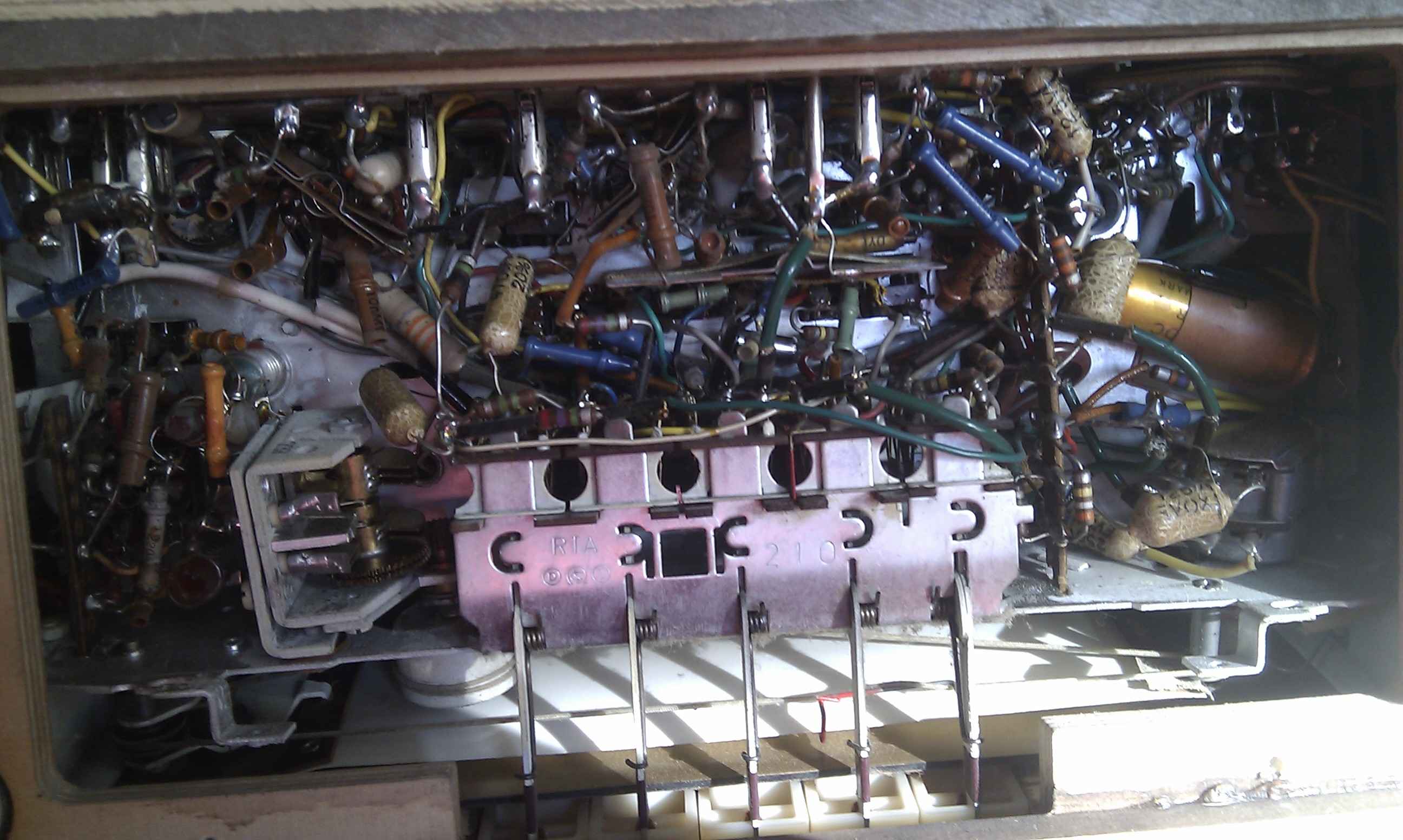 En pystynyt kokeilemaan tuota levysoittimen liitännän sormeilua. Tuossa on vain pa, la, ka ja ula nappulat. Ja sitten ~ nappula josta ilmeisesti vaan sammutetaan virta. Ylempänä on kolmen nappulan kytkimet joista on napit poissa, enkä tiedä mitä virkaa niissä on. Laitan oheen kuvan vähän vastaavasta radiosta missä ne vielä löytyy.