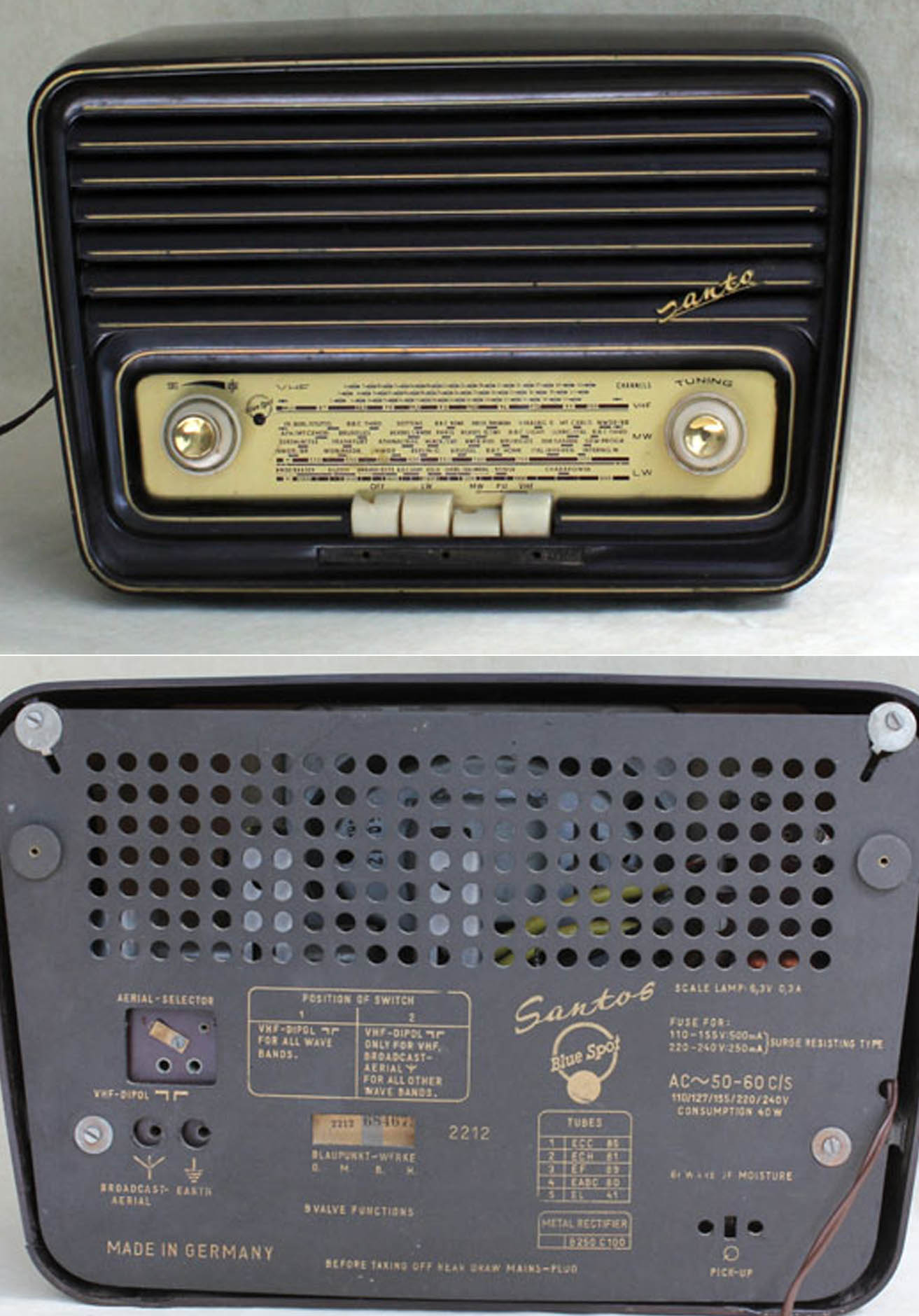 Eteen sattui englanninkielisin tekstein varustettu Blaupunkt Santos 2212. Rmorgin mukaan radio on mallivuodelta 1955-56. Radioiden tuonti Suomeen oli vielä tuolloin lisenssimenettelyn alaista. Valmiille pöytäradioille ei helposti myönnetty tuontilisenssejä. Ilmeisesti perusteltuihin tarpeisiin, esim. messuille, lisenssejä myönnettiin pienehköille erille. Kun radioiden tuonti vapautui vuoden 1958 aikana, Blaupunktit tuotiin käsittääkseni yleensä pohjoismaisena versiona, jossa tekstit olivat ruotsinkielisiä.