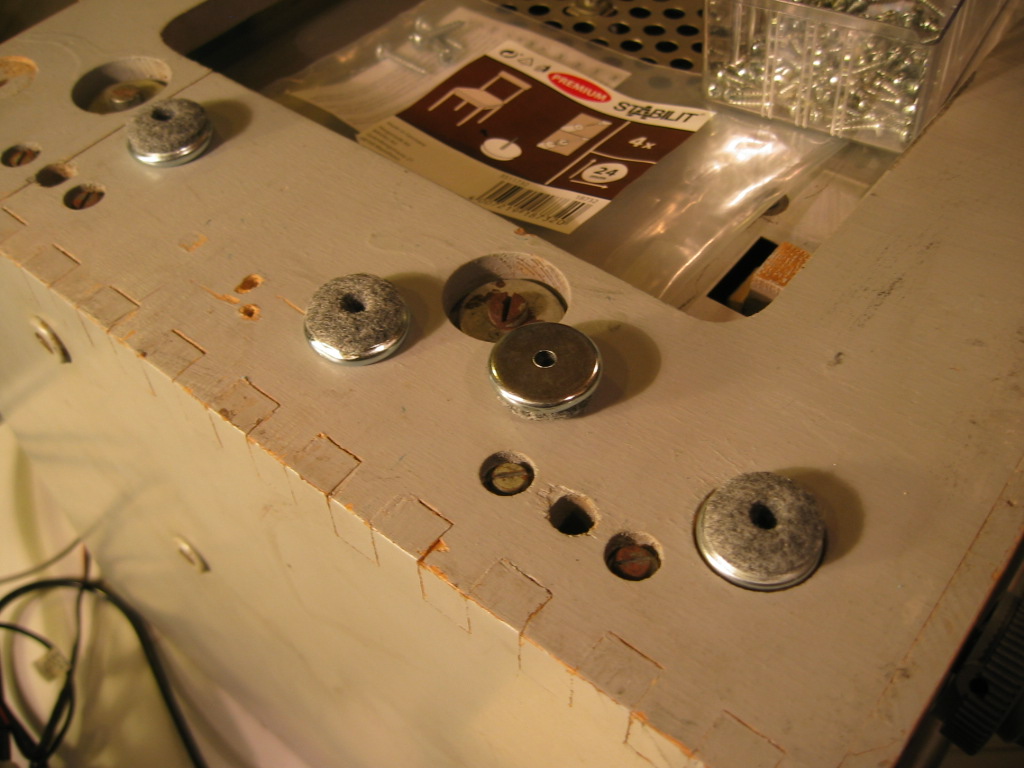 Alkuperäisistä huopatassuista oli pari hukkunut. Jäljellä olevat muuten hyvässä kunnossa, mutta joku mato tehnyt pesän niihin. Kävin rautakauppakierroksen tutkimassa mitä löytyy. Bauhausista löytyi kuvassa olevat vähän korkeammat harmaat huopatossut. Korkeus on oleellinen juttu kun tämä radio ottaa jäähdytysilmaa alta. Pieni kauneusvirhe on tassujen metallinen sokkeli mitä alkuperäisissä ei ollut.
