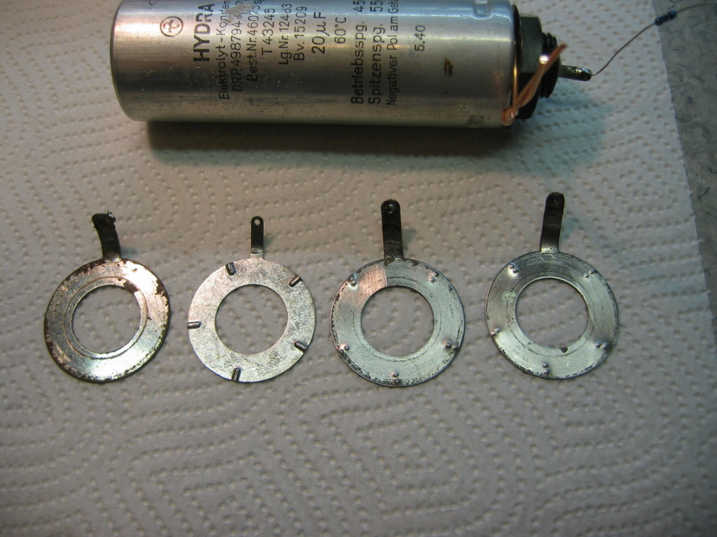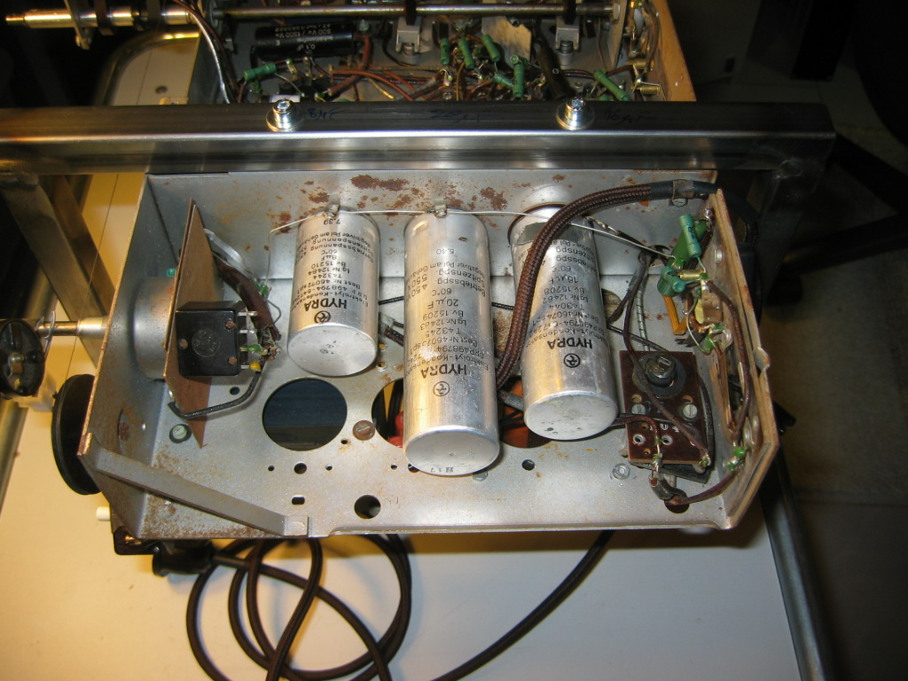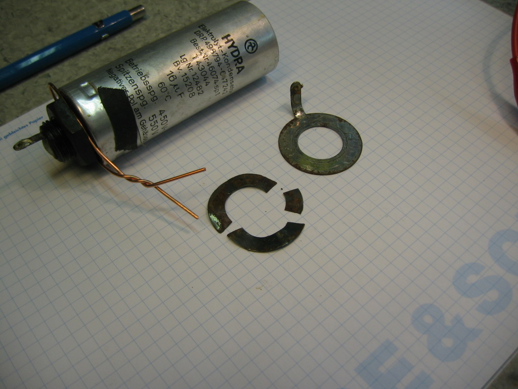 Kaikissa konkissa oli tollanen teräksinen "aaltolevy" mikä pitää liitoksen varmasti kireällä. 16uF konkasta tosin murtui avattaessa. Ruostunut poikki. Tuo 16uF konkka on eristertty chassiksesta, mutta siinäkin oli sama vika ja samanlainen peltiprikka miinus navan kytkentää varten. Miinus menee 10 + 15R vastusten kautta maihin ja jälistä otetaan pääteasteelle joku bias jännite.