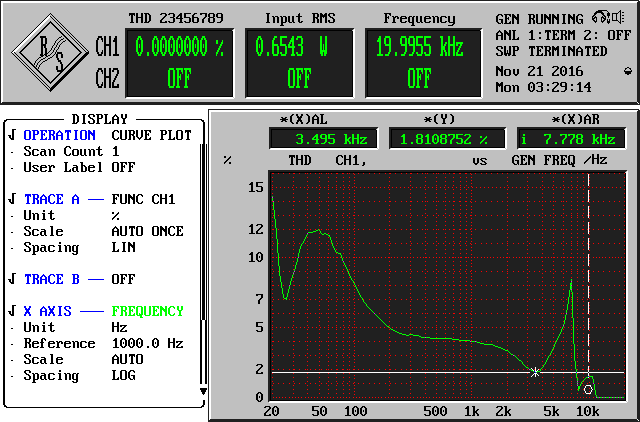 Tässä vielä THD taajuuden funktiona. Signaalin voimakkuus sema kuin edellisessä 1kHz / 1W out mittauksessa.