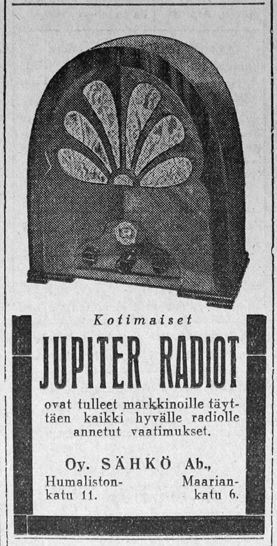 Etsin lisätietoja kotimaisesta Jupiter-radiosta. Onko radiota mahdollisesti jossakin kokoelmassa? Turkulainen Oy Sähkö Ab mainosti näitä paikallisissa sanomalehdissä ainakin vuosina 1932-33.