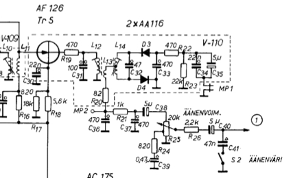 Joissain radioissa on R22 470 ohmin vastuksen tilalla trimmeri joka erään huolto-ohjeen mukaan säädetään niin että vt-vahvistimelle syötetään AM-moduloitu signaali ja trimmeri kierretään minimiulostuloon. Tästä voisi päätellä että tuo vastus kannattaa tarkistaa ja myös ilmaisindiodit saisivat olla mahdollisimman samanlaisia.