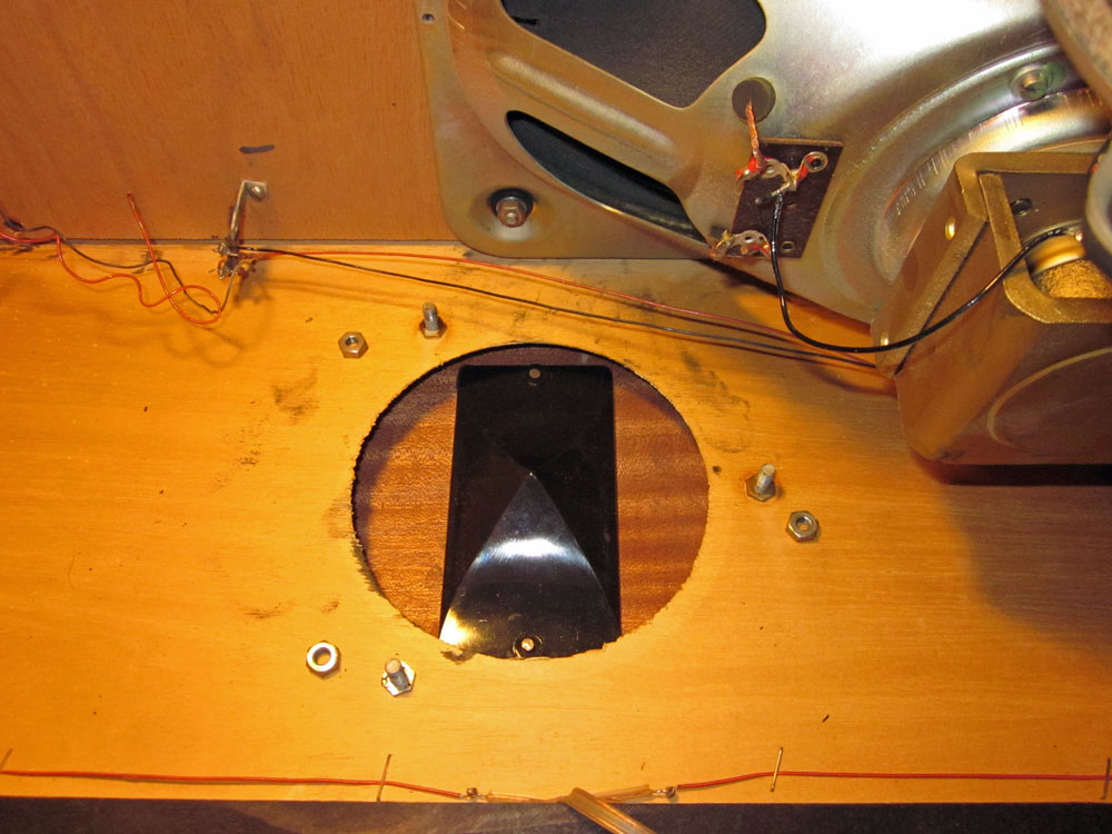 Basso ämyrit on ruuvattu levyyn joka voidaan vetää ulos. Diskantit ovat elektrostattiset sivuilla.
