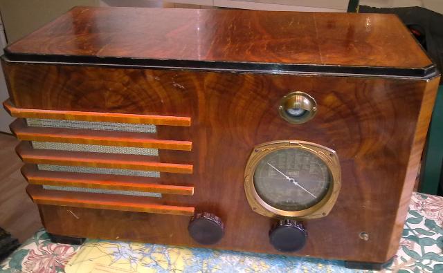 Kirppikseltä tuli taas tilan täytettä!! Tällainen isohko HETRO radio, amerikkalainen, luultavasti vuosi vv. 36-37. Kotona vasta ihmeekseni huomasin, että radiossa oli supisuomalaiset asteikkotekstit !!! Ja merkintä 220V. Muuntaja ja sisuskalut näyttivät äkkikatsomalta aivan alkuperäisiltä.