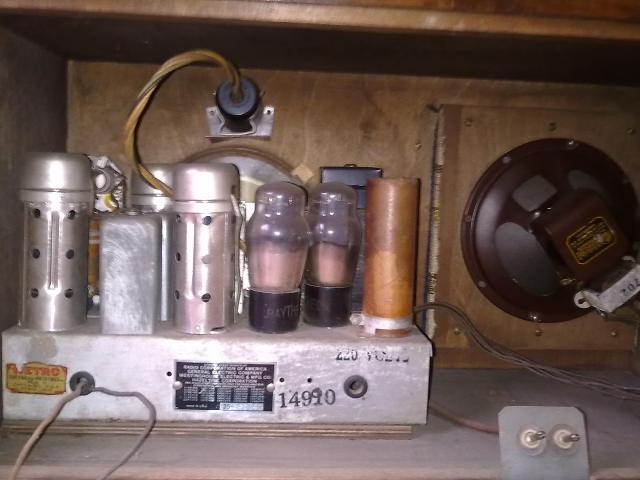 Sen verran sain selville, että putket ovat juuri nuo kaavion mukaiset Raytheonin putket, paitsi silmäputki Hytron 6G5. Kaikki vaikuttavat alkuperäsiltä. En saanut chassista vielä pois kun asemanappula on jämähtänyt...liuotkoon rauhassa.