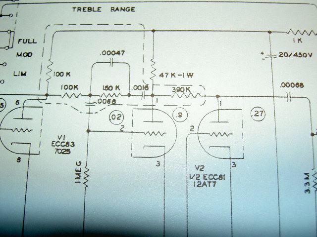 Keraaminen piiri on kulmasta tummunut ja jotain tahnaa tullut ulos, laitoin siihen epoxia kun ajattelin, ettei konkat kuivuisi jos ne ovat vuotaneet. Taisi olla turha operaatio, En tiedä mitä teen, teenkö erilliskomponnenteista uuden piirin? mittasin toisen kanavan vastaavan osan vastukset ja kondensaattoriasetuksella mitä pystyin. Ainoastaan sen 100k ja 390k vastuksen arvon pystyin/osasin varmasti oikein mitata ja ne oli ainakin kunnossa. Toisessakin on vastaavassa kohdassa tumma kohta muttei ole mitään läpi päässyt. Kuvassa piiri ja kytkentä . Piiri on päästänyt läpi kulmasta mistä johto menee ECC83.n kuutos nastaan (anodiin).