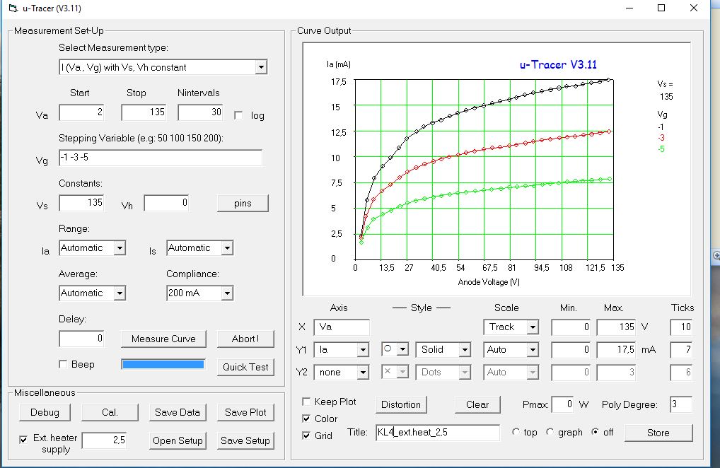 Tutkimus jatkuu... Otin referenssikäyrät KL4 putkesta tasan 2.0 Voltin DC paristolla ja sitten uTracerin omalla hehkulla 3.0 voltista alaspain 0.1 välein. 2.8V tuotti täman putken hehkuvirralla juuri saman käyrän. Siis tässä 2V pitää olla 2.8V oikean käyrän saamiseksi.