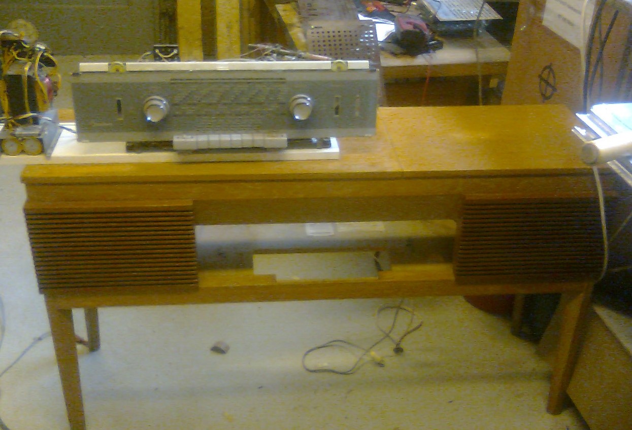 Tommonen kukkapöytä kyseessä, jos autotallin hämyssä otetusta kännykkäkuvasta jotain selvää saa. Kissa on nostettu pöydälle, eli koneisto pöydän päälle. Koneessa myös erillinen virtalähde osa, josta 0,5m johtonippu varsinaiseen koneistoon. Pöydän kummassakin päässä ovaalit 6x10" kaiuttimet, ja oikessa reunassa kannen alla levari.