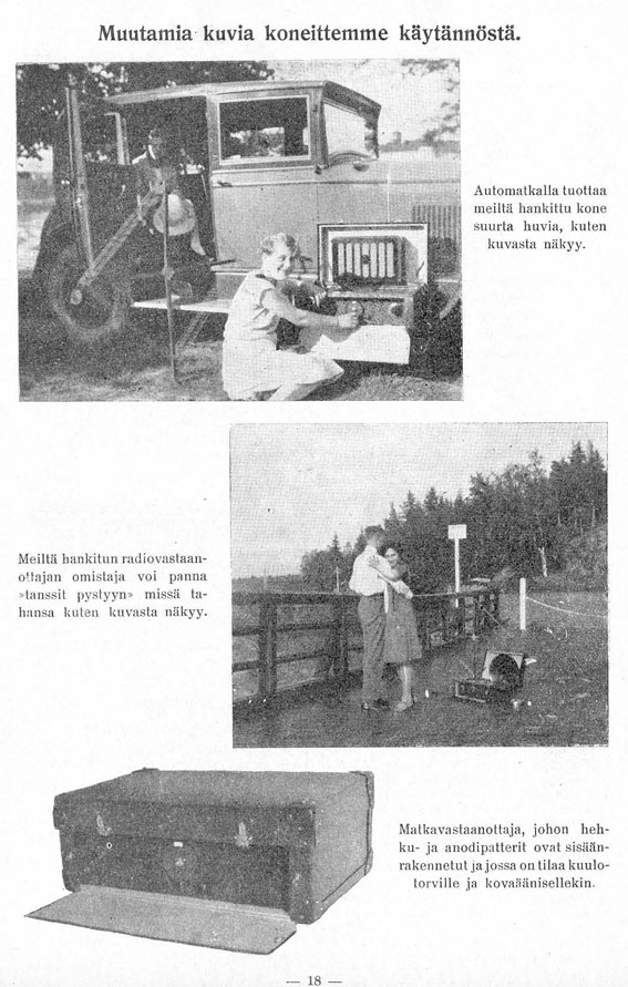 Tekniikan Maailman n:o 2/2000 sivulla 32 on hieno kopio "Radiosanoma" lehden n:o 6-7/1927 kansilehdestä. Vahinko, etten uskalla kopioida sitä tähän. Kuvassa on "AMARADIO"n mainos, jossa tyttö kuuntelee matkaradiota auton astinlaudalla. Tekstissä mm: "Suurimman nautinnon ja huvin kesäisestä automatkastanne saatte silloin, kun Teillä on mukananne Amaradion valmistama matkavastaanottaja"