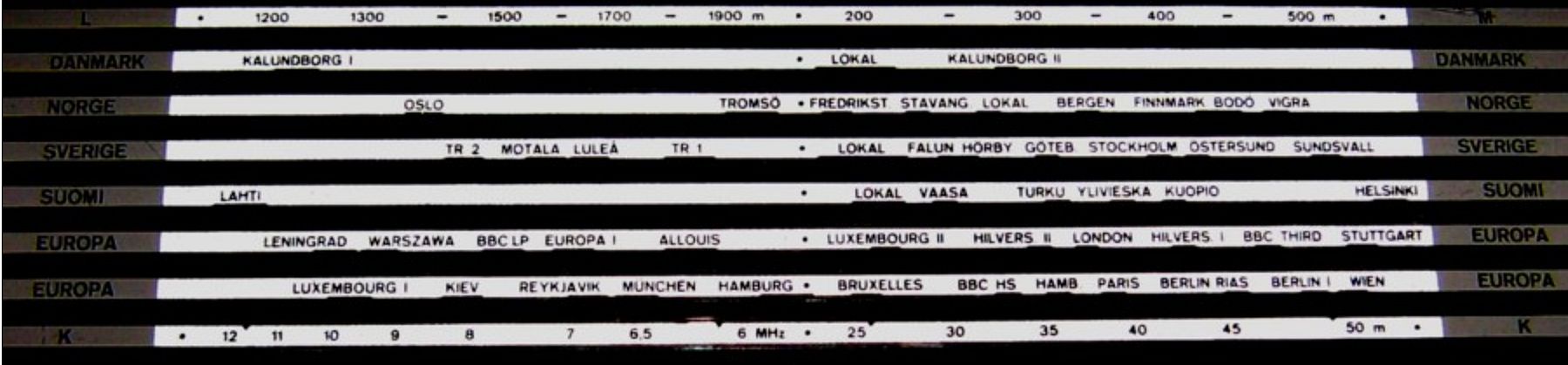 Sitten vasemmalla pitkäaaltoasemat ja oikealla keskiaaltoasemat lähetin paikkojen mukaan, ylimpänä kummatkin metreinä.