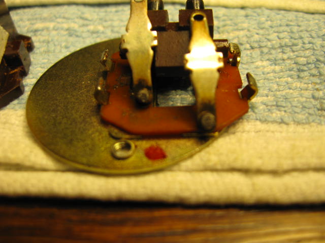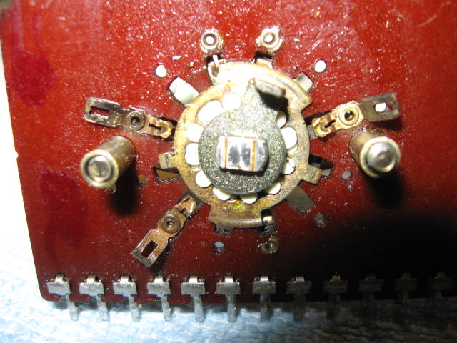 Näissä malleissa virtakytkin on osa kytkintä, jolla kytketän lisäksi kaiutinparit A ja B erikseen päälle tai sitten molemmat parit yhtä aikaa päälle. Samoin tällä ”multi”kytkimellä kytketään kaiuttimet kokonaan pois, jos kuunnellaan kuulokkeilla. Kytkin oli hankalasti irrotettavissa. Jotta sen sai esille ja irrotettua, niin osa kotelon paneeleista ja valolista piti irrottaa ja esim. laitteen virtalähde piti väliaikaisesti siirtää sijoiltaan. Lisäksi koko kytkin oli mutterikiinnityksen lisäksi juotettu piirilevyyn kahdellatoista juotosrivalla, jotka piti sulattaa ja imuroida puhtaaksi. Sen jälkeen, kun kytkin oli irrallaan, niin se oli suhteellisen helppo purkaa ja tarkistaa kunto. Varsinaiset AC –puolen metalliset kytkinliuskat olivat tosiaan kosketuspinnoiltaan todella huonossa kunnossa ja täynnä kiinnipalanutta karstaa. Laitan tuohon muutaman kuvan, joista selviää mm. kosketuspintojen kunto ennen puhdistusta ja osaksi myös puhdistuksen jälkeen. Nyt kun koko ”multi”kytkin oli pöydällä hajotettuna, niin puhdistin ja voitelin myös samalla kaiutin- ja kuulokeliitäntäkosketuspinnat.