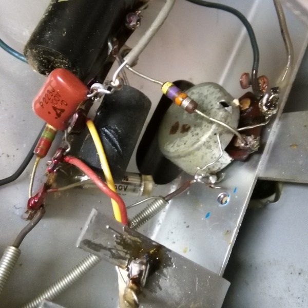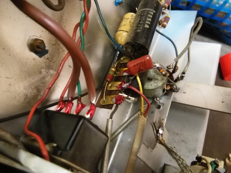 Potikan osalta pitäisi olla skema, vois katsoa onko kytkentä edellisen tinurin jäljiltä oikein ja tarkistaa onko se uuden näköisen polyester konkka oikean arvoinen.