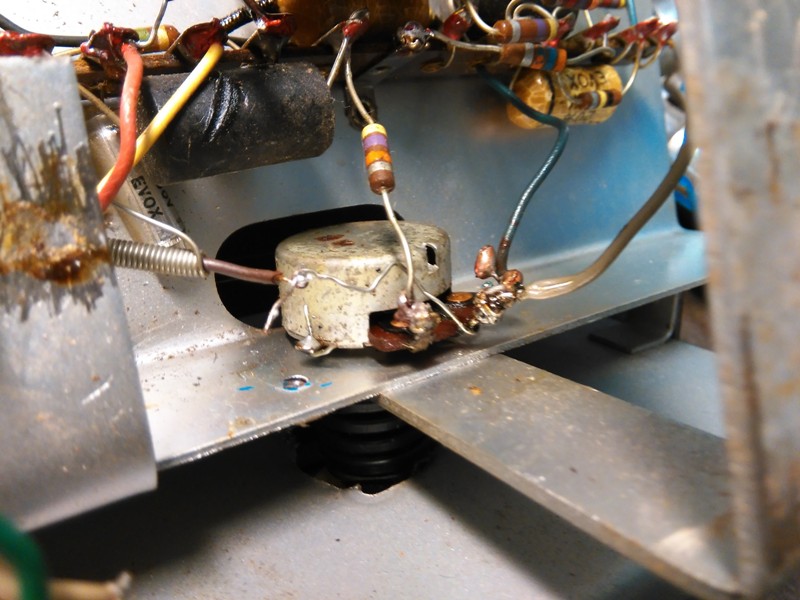 Potikalle tuleva vastus, siinä taitaa olla kylmäjuotos, näyttää kun vastuksen kytkentälanka olisi tinassa olevassa reiässä.
