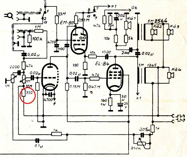 Tätä vastusta en löytänyt ainakaan tuosta kytkentäkaaviosta. Tarkoititko mahdollisesti EM80:n 330 ohmin katodivastusta, joka on kytetty maahan?