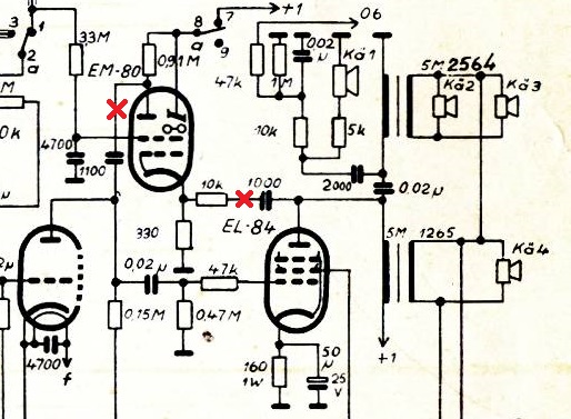 1) Poista EL84 anodilta (pin6) EM80 katodille (pin2) menevät 10k vastus.+1000pf kondensaattori.