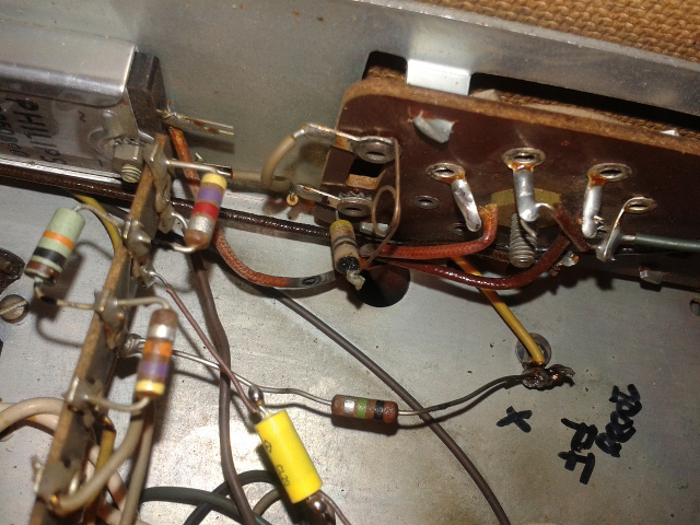 Tässä vielä tutkiskellessani Concertoa tänä iltana huomasin, että tasasuuntaajan miinus -navan ja radiokoneiston kytkennän väliin on laitettu jonkinmoinen vastus-lämpösulakeviritelmä. Tuo on käynyt aikojen saatossa erittäin kuumana, sillä tummuneeseen vastukseen koskettaneen johtimen (vie vaihtovirtaa tasasuuntaajalle) eriste on hiiltynyt. Kyseinen kytkentä on ainut kohta, jonka kautta koneisto on liitetty tasasuuntaajan miinus -navalle.