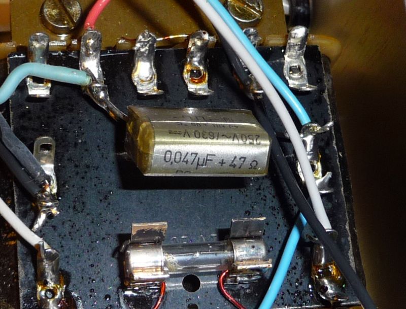 Tandberg 3000X kelanauhurissa on moottorikytkimen napojen rinnalla 0,047uF + 47 ohm / 630 V häiriönpoistokondensaattori. En ole nähnyt ennen tällaista konkka-vastus-komponenttia, Frakon metallihohtoinen neliskanttinen pullistunut konkka. Olen vaihtanut vastaavia muutamiin muihin nauhureihin, joissa ne ovat tummentuneet, mutta eivät ole ehtineet vielä pamahtaa pitkin seiniä.