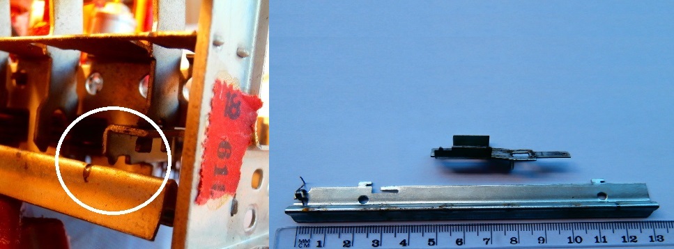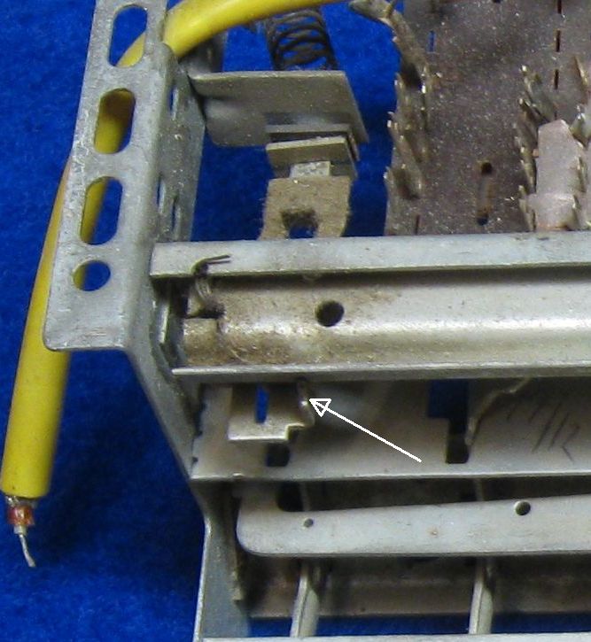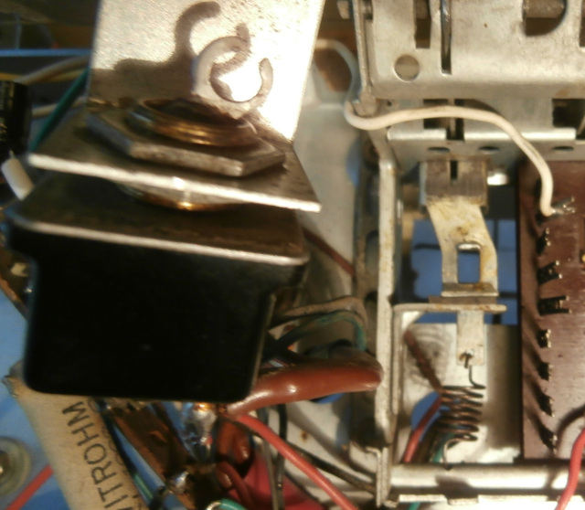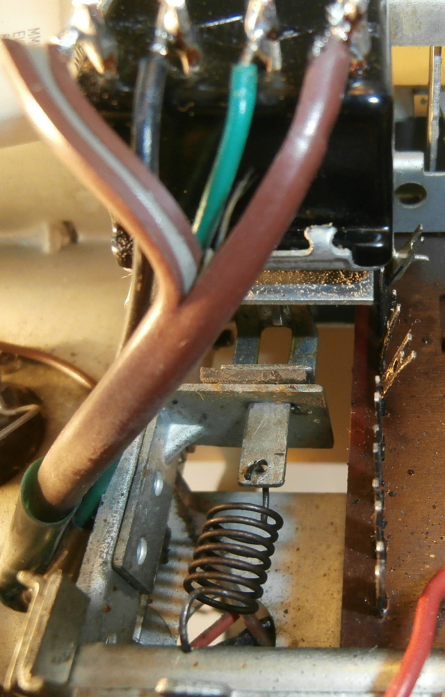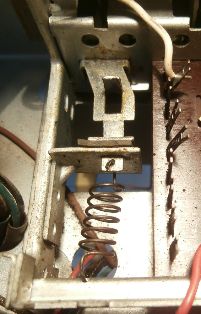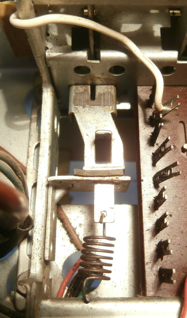 Kun kaikki radion painikenäppäimet on yläasennossa, niin kuvassa näkyvä jousi vetää vipukytkimen ON asentoon ja kun radion laittaa sähköihin, niin syttyy asteikkovalot ja putkihehkut. Onko kenties haluttu että radio on sähköissä ollessa herätevirroissa, että esim. painettaessa ula painiketta radiosta alkaa kuulumaan heti kun putket on valmiiksi lämmenneet? Onko vaihdettu vääränlainen vipukytkin tai puuttuuko tästä jotain osaa toiminnan kannalta?