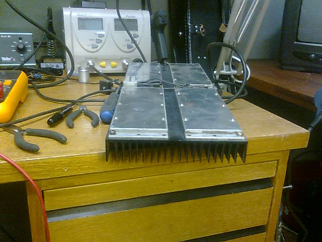 Eihän tämä paljon rakentelua kaivannut, mutta kun noista puretuista robottien servopakeista on jäänyt nurkkiin jäähdytyslevyjä, ja degenerointivastuksia, niin ajattelin tehdä tommosen pienen keinokuorman. Siinä on neljä kpl 30ohm/180W vastuksia ruuvattu 150mm x 350mm jäähdytyslevyyn, ja kytketty rinnan. Mahtaakohan kestää putkiradio testauksessa tollaisenaan, vai pitäiskö kytkeä vielä puhallin?