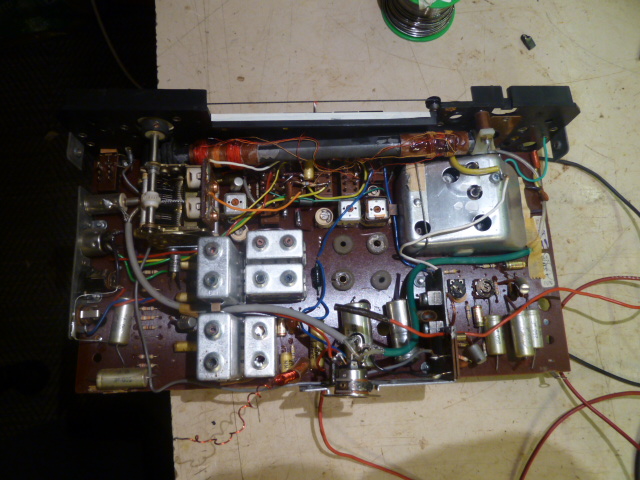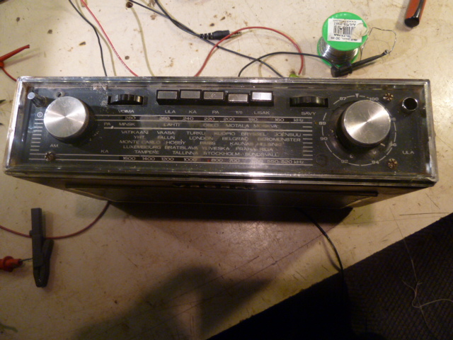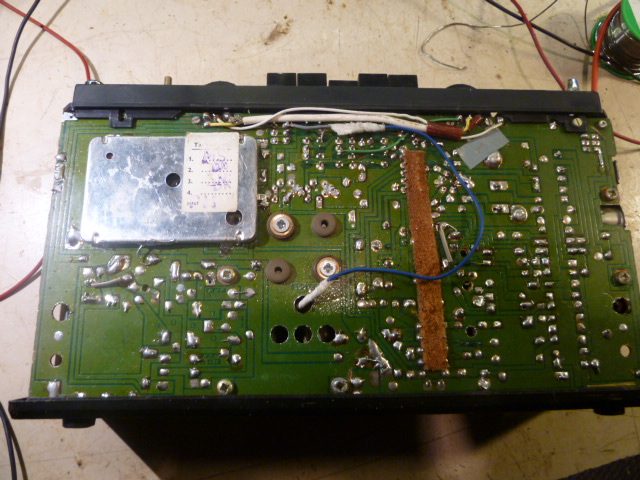 Kortilta selvisi, että radio-osassa ei näy mitään jännitteitä. Kytkinkaaviosta ei selvinnyt, miten sähköt sinne menee. Sitten välähti, että jos laite otti tuon 100mA virtaa jonnekin, minne sen ei kuulu mennä, niin sehän on lähes watti ja hiukan jo lämmittää. Nostin jännitteen 10,5V'tiin (silloin otti 140mA) ja aloin tutkia sormella osia. Pian selvisi, että pääteasteen alla oleva 220ohm vastus kuumenee.  Sen vieressä on 500uf Konkka ja ajattelin pikaisena kokeena katkaista siitä toisen johdon ... virta tippui heti 60mA'riin. Oli siis vuotava .  Vieläkään ei radio-osasta löytynyt kuin noin 300mV. radio-osassa oli 2 samanlaista elkoa ... edellisestä 'viisastuneena' katkaisin toisesta johdon ... ja virta tippui 30mA'iin ja nyt alkoi välitaajuustrankuissa olla luokkaa 7V . Vaihdoin nuo 2 radio-osan elkoa. Sitten kokeilin ulkoisella audiovahvistimella sieltä viimeisen kelapurkin (ilmaisimen) paikkeilta ihan hakuammuntana, josko jostain kuuluisi jotakin. Painelin vahvarin inputtia kortin nastoihin ja noin 5's paikka oli osuma ... ULA toimi täysin selkeästi ja jokin asema sattui olemaan (tässäkin) täysin paikallaan. Kokeilin myös AM asemia ja keskipitkillä oli terve vastaanotto. Radio-osa ok!!!