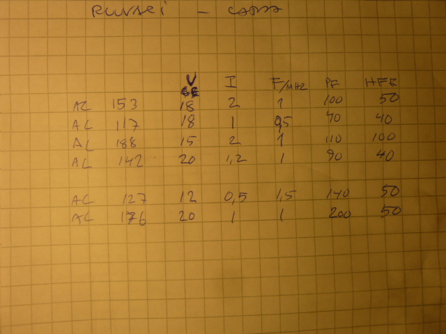Minulla ei ollut tuollaista AC153 trankkua ja tutkin netistä, minkä voisi laittaa tilalle. Ohessa lista ominaisuuksista ....AC 153 ja ne joita minulla oli. Päätin laittaa tilalle AC142. Nyt alkoi myös pääteaste toimia ... mutta vain hetken. Oltuaan päällä noin 15sek jännite putosi taas noin 5 voltiiin ja virtaa meni 1,1A (joka oli virtarajana). kun sammutin radion ja laitoin uudelleen päälle, niin taas kesti noin 15 sek ja jännite romahti. Tämä oli mielestäni ihmeellistä. Jonnekin meni taas virtaa. Oli aika luonnollista epäillä toista trankkua. Kun 1,1A virta kulki napsautin poikki sen kollektorin ... ja virta asettui heti 0,03A'iin. Siis tämäkin trankku oli ihmeellisellä tavalla sökö. Minulla ei ollut toista AC142'sta , joten laitoin ominaisuuksien perusteella suht samanlaisen ... AC 117. Nyt alkoi pääteaste toimia ja virta pysyi sopivasti 0,03A'ssa ... jos nosti voluumia, niin otti noin 0,1A. Ääni oli puhdas, mutta ohut. Kokeilin tuolla usein käyttämälläni ulkoisella 4ohm kajarilla, jossa on pieni reflexiputki ... ja johan lauloi blaukkari hienosti. Tietysti tuollainen 35*40*12cm testikajari ei ole 'matkakelpoinen'.