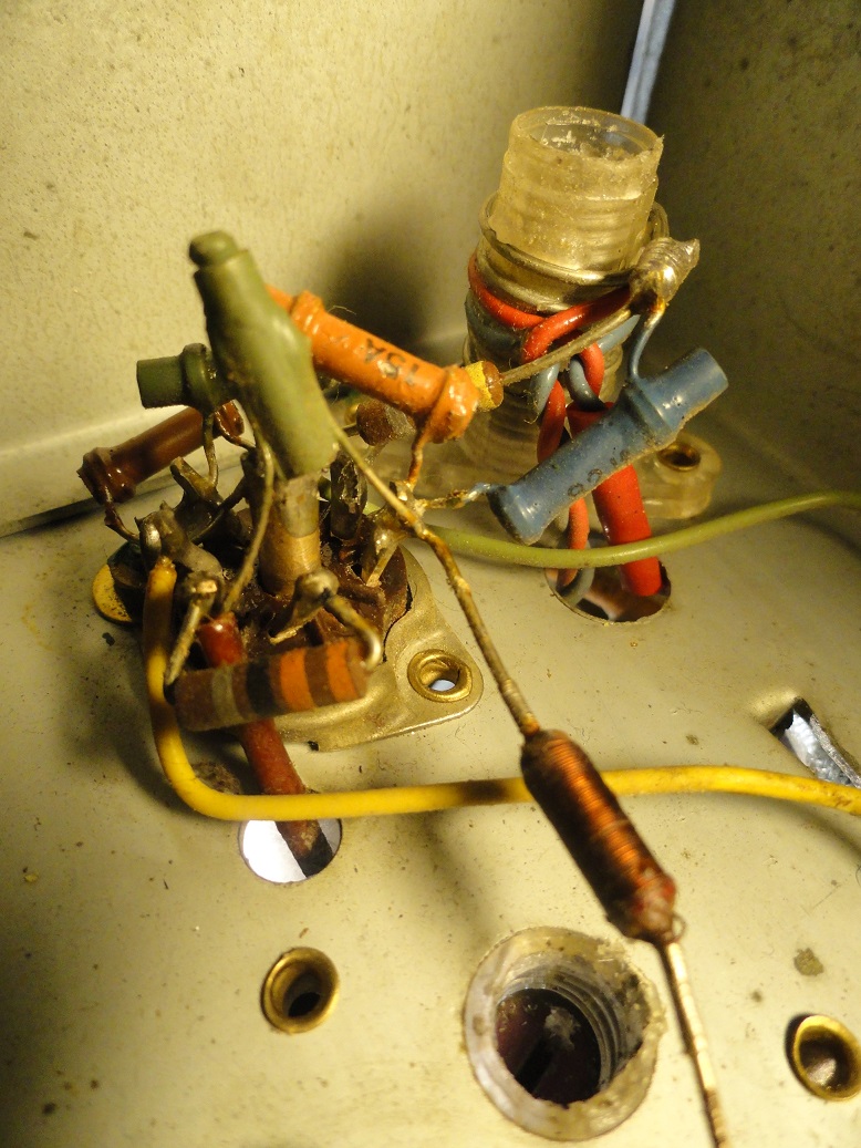 Eilen jäin ihmettelemään tuota vihreää konkkaa EC92 anodin vastukselta katodille, joka on konkan kautta maassa. Tuo konkkahan 'oikosulkee' Ula taajuudet. Otin sen kokeeksi irti ja mittasin. Ohm mittarilla ei johda yhtään. Kapasitannsimittari näyttää 2,5pF ... voikohan luottaa? Ula toimiin ihan yhtä huonosti vaikka konkan poistaa . Ohessa tarkempi kuva tuosta ihmeen kohdasta. Vihreä osa on tuo konkka.