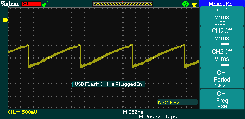 Ohessa kuva jännittestä elkon C42 yli (kun Elkon toinen johto irti). Skoopin taso 0,5V/div.
