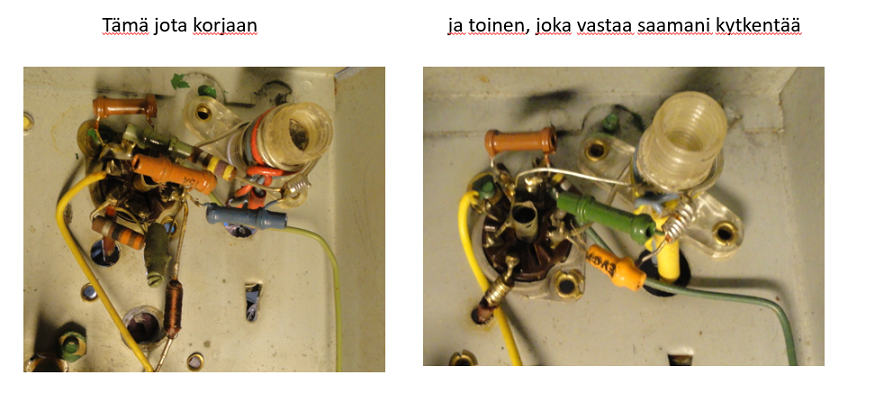 Aloin mittailla jännitteitä .Selvisi kuitenkin, että kytkentäkaavio ei vastaa tämän omani kytkentää. Se huonompi kuntoinen 810 näyttää vastaavan ainakin paremmin. Ohessa kuva molempien radioiden EC92 kohdan osista. Eroa on paljon.