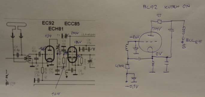 Ohessa kuva EC92 kaaviosta ja oman radioni todellinen kytkentä (muutinj kuvaa, koska siinä oli virhe) . Kuviin myös merkitty jännitteet. Hiukan ihmeellisiä? ECC85 putken hilalla 50V ja katodilla 104V?? varmuudeksi vaihdoin tuon C5sen . Ei vaikutusta. Kokeilin myös parilla muulla ECC85 ... suunnilleen samat jännitteet.