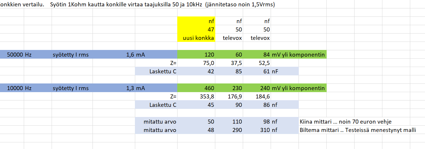 Kyllä tässä tapauksessa mittaustulokset on ihan riittävän tarkkoja kun vastusten ero on noin suuri. Pystyisitkö vielä mittaamaan nuo kondensaattorit vaikka luokkaa 1 MHz taajuudella, nähtäisiin kuinka sekaisin paperikondensaattori menee?