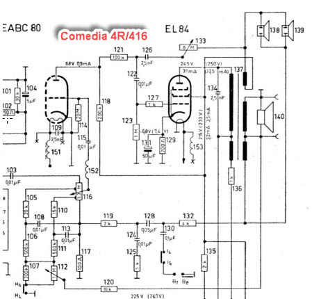 Kopion linkin kaaviosta palan tähän liitteeksi. Voimakuuspotentiometri on nro 116 ,jonka yläpäähän tuoda äänisignaali ilmaisimesta. Koska näköviritysputki reagoi oikein, on ilmasin kunnossa. Kuten kaaviosta näkyy on vol.potissa kaksi ulosottoa joihin on kytketty hieman "monimutkaisia" äänenmuokkauspiirejä ja joita ohjataan pääteasteen takasinkytkennöillä vastusten 120 ja 132 kautta sekä valintakytkimillä. Potentiometri on 112 on bassopään säätö.