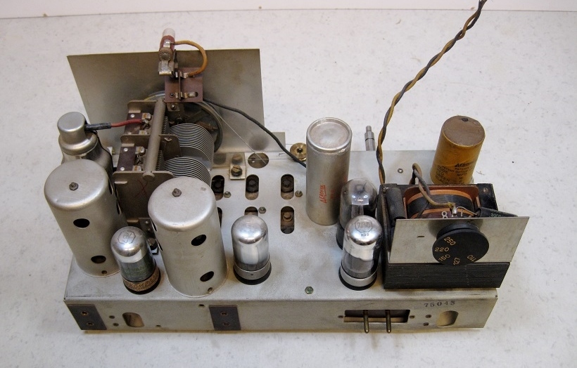 Irroitin putket ja ne on vasemmalta oikealle, (peltihupun sisällä) 6J8EG, 7B7, 7C6, 7B5, 6X5GT, putkien kannat on ihan