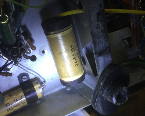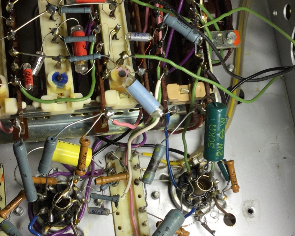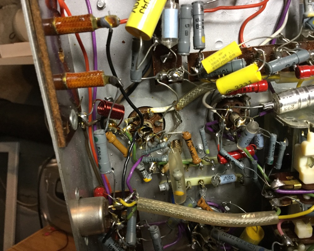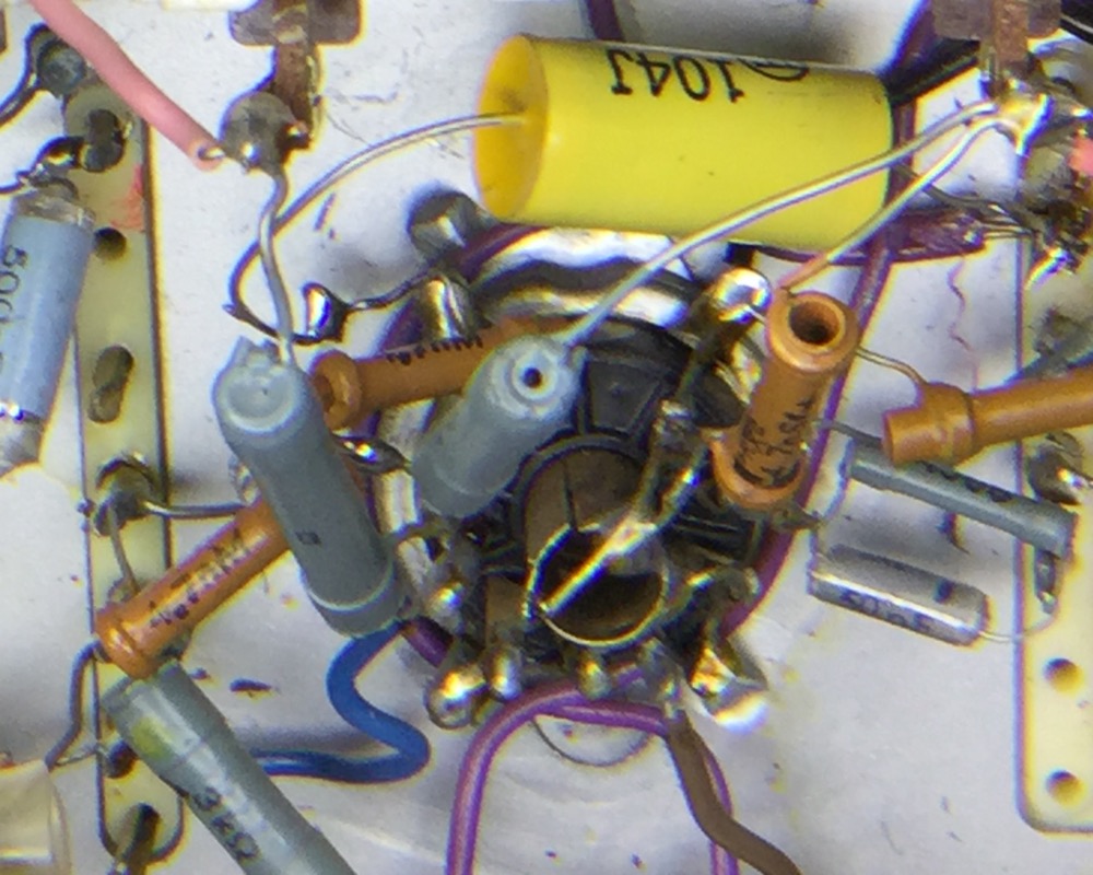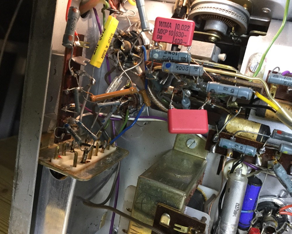 Kun heilautin kuvassa näkyvää kierrettyä piuhaa, putken jalan päällä, niin koko radio hiljeni. Vahvaa virtaa tulee kuitenkin putkille, mutta ei muuta. Vaihtelin m. Sulakkeet. Tuokaan ei vaikuta.