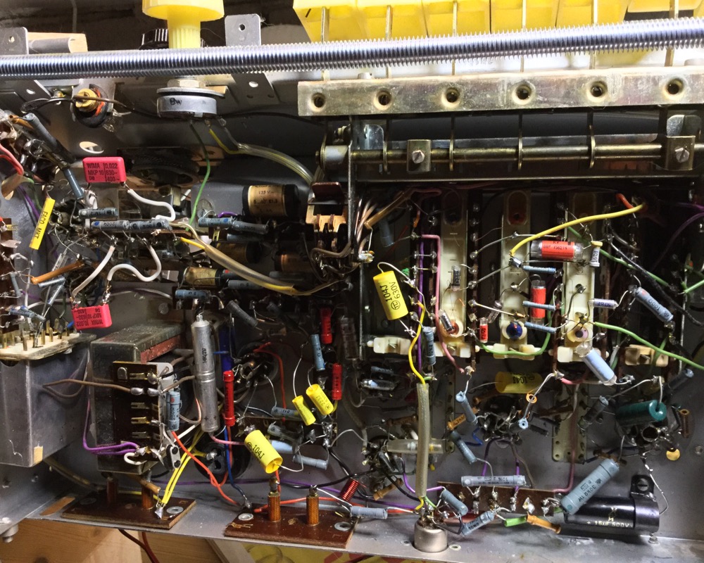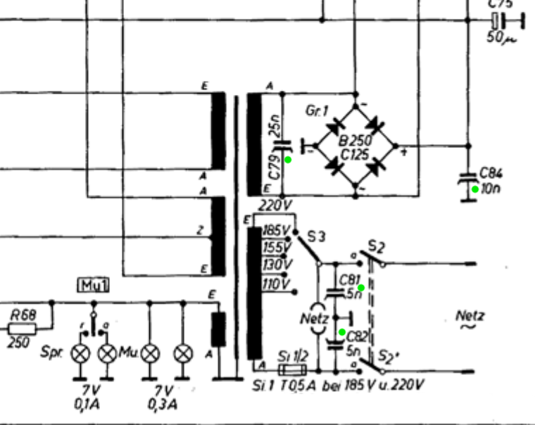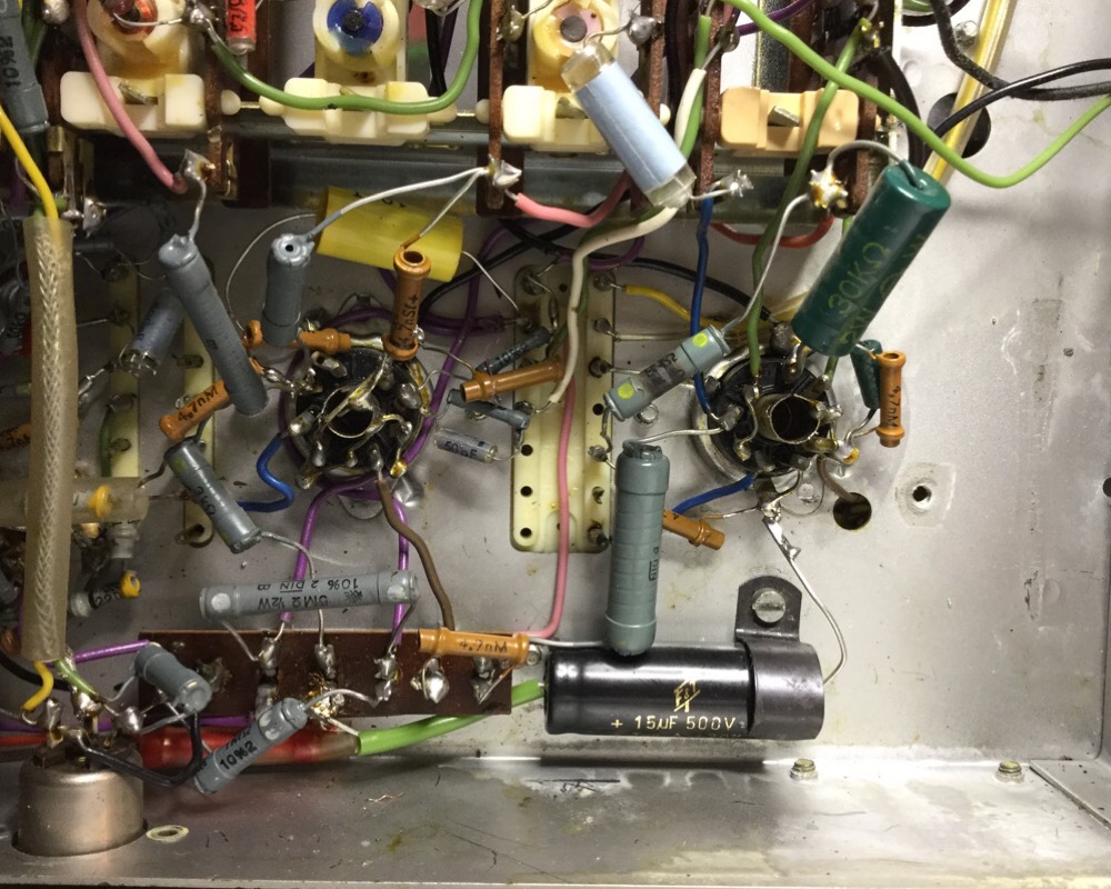Mitenkäs EF85, onko 7 ja 8 jaloissa jännitteet kohdillaan? onko siinä uusi vai vanha putki? Kaaviossa EB91:n yläpuolella on kytkin T4 joka kuuluu levari näppäimen kytkimistöön, jos siinä on kontaktikatkos, EF85 jää ilman suojahilajännitettä, ja putki ei johda, ja äänekset tyssää siihen.