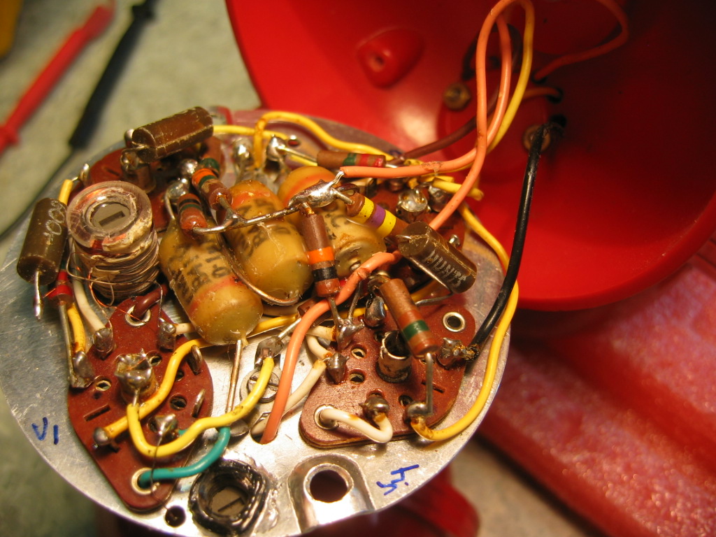 Tässä vielä kuva äänenvoimakkuusvalitsimesta ja konkista. Hauraan oloisia huo HUNTS:in ruskeat muovikuoriset konkat. Tarkkaan kun katsoo niin johdotuksessa löytyy muutama paikka mikä on jo valmistusvaiheessa poltettu lanka johtimen eristeen läpi. Pitää vielä tutkia lisää ennen kuin yritän jännitteitä päälle.