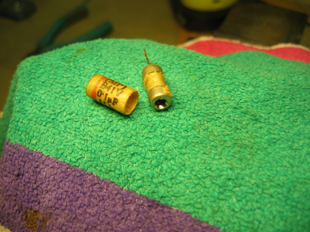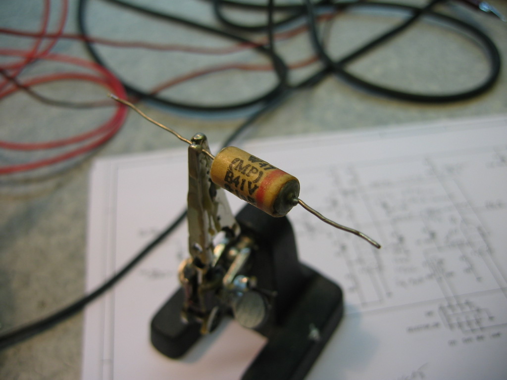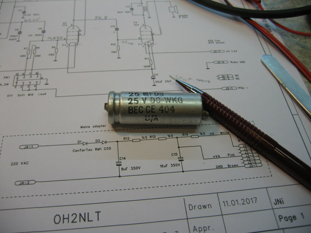 Tänään radiossa oli +90V VA päällä muutaman tunnin. Vuotovirta laski 110uA tasoon. Tämä on minulle uusi ilmiö paperi/muovi konkissa. Elektrolyytti konkkkien elvytykselle pitkän varastoinnin jälkeen on selvät perusteet, mutta nämä paperi/muovi konkat tai paremminkin niiden käyttäytyminen oli uusi juttu. Viitaten aiempaan piirikaavioon vaihdoin kuitenkin C6, C7 ja C9 konkat. Lisäksi vaihtoon meni 25uF katodi konkka C11 minkä kapasitanssi oli pudonnut 30nF luokkaan. Näillä vaihdoilla jännitteet alkoivat näyttää loogisilta ja 90V vuotovirta putosi 62uA tasoon. C6 ja C12 vuotaa vähän, mutta eivät vaikuta kytkennän toimintapisteisiin. Jätin ulkonäkö syistä alkuperäiset. Tämä konkanvaihto on vielä tekninen eikä ota kantaa ulkonäköön. Jos vehje lähtee toimimaan niin myöhemmin pitää rakentaa replicat alkuperäisten sisään.