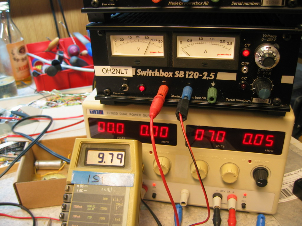 Konkat kiinni ja tarkistusmittauksia. Naamiointi kelvannee. Vielä pitää ratkaista ruskeiden muovikuoristen HUNTS konkkien replikointi.