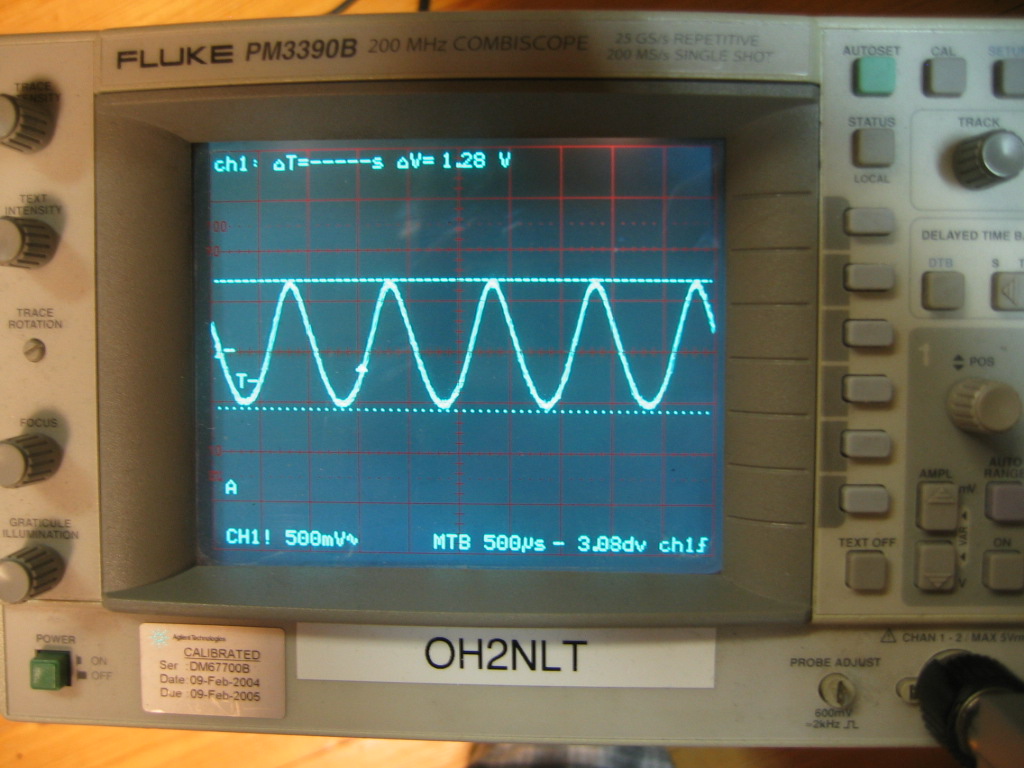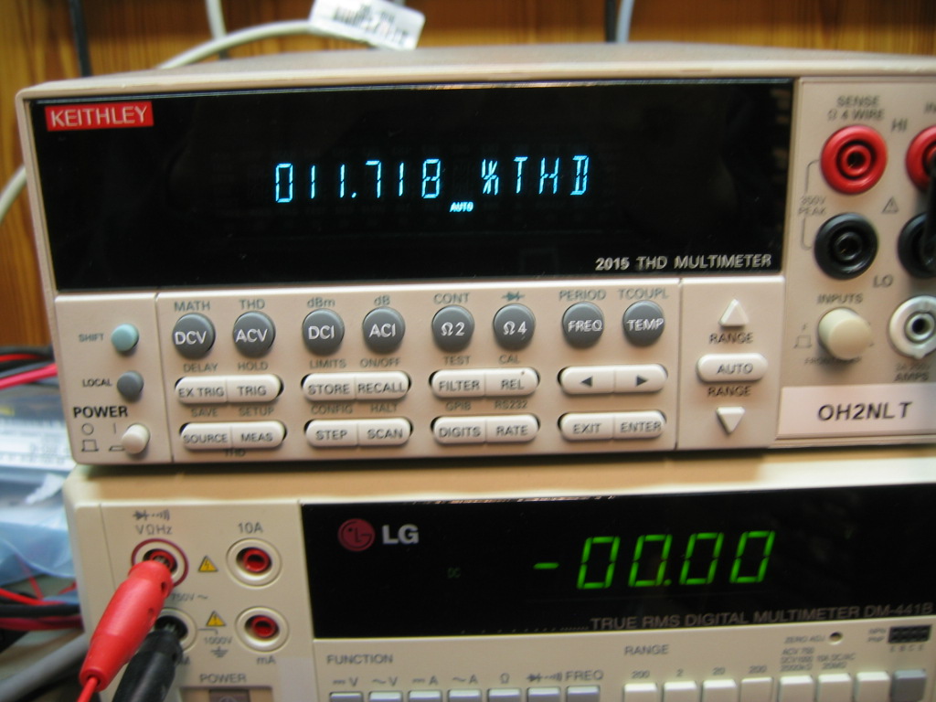 Tarkistusmittauksissa katsoin vähän myös signaalin laatua. Modulaattorina R&S SMY02 sisäinen 1kHz audio-oskillaattori. Skooppikuva ja THD mittaus kaiutinlinjasta. Ämyrin koko ja ominaisuudet huomioon ottaen ihan käyttökelpoinen peli.