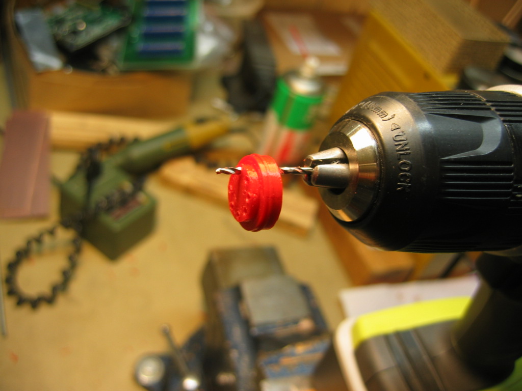 Printtauksen jäljiltä reijät tarkempaan mittaan. Tiukkojen piikkien paikalleen painaminen siten, että menevät suoraan ja jäävät oikeaan syvyyteen osoittautui vaikeaksi. Uhrasin vanhan kolvin terän. Laskin sen sorvilla suoraksi ja porasin reijän päähän. Tällä työkalukka piikit upposivat PLA muoviin halutulla tavalla.