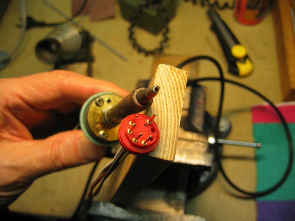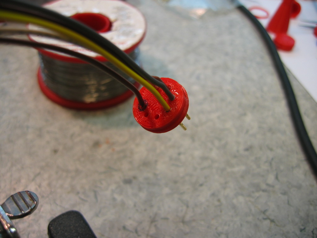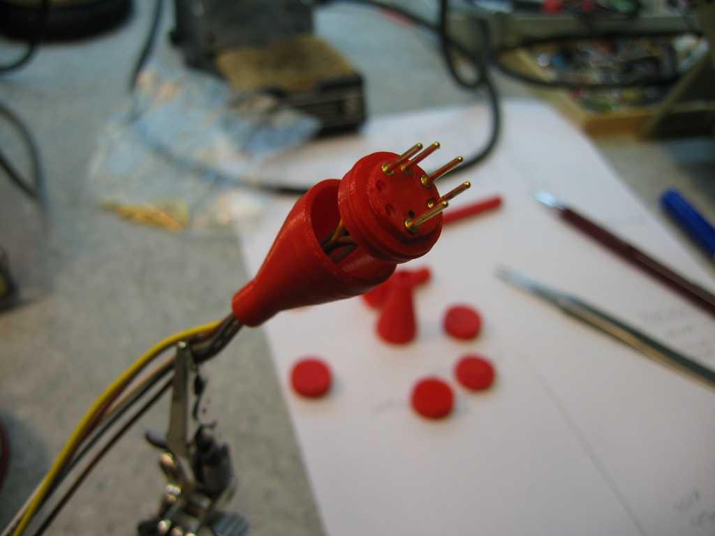 Löytyi sopivia 1mm liittimen uros piikkejä. En tosin tiedä minkä kun pussissa ei ollut mitään tunnisteita tallelle. Sain houkuteltua 3D tulostus osaston tekemään B7G liittimelle rungon mihin nämä piikit sopivat. Ensimmäinen proto tuli PLA muovista kun sitä sattui olemaan punaisena.