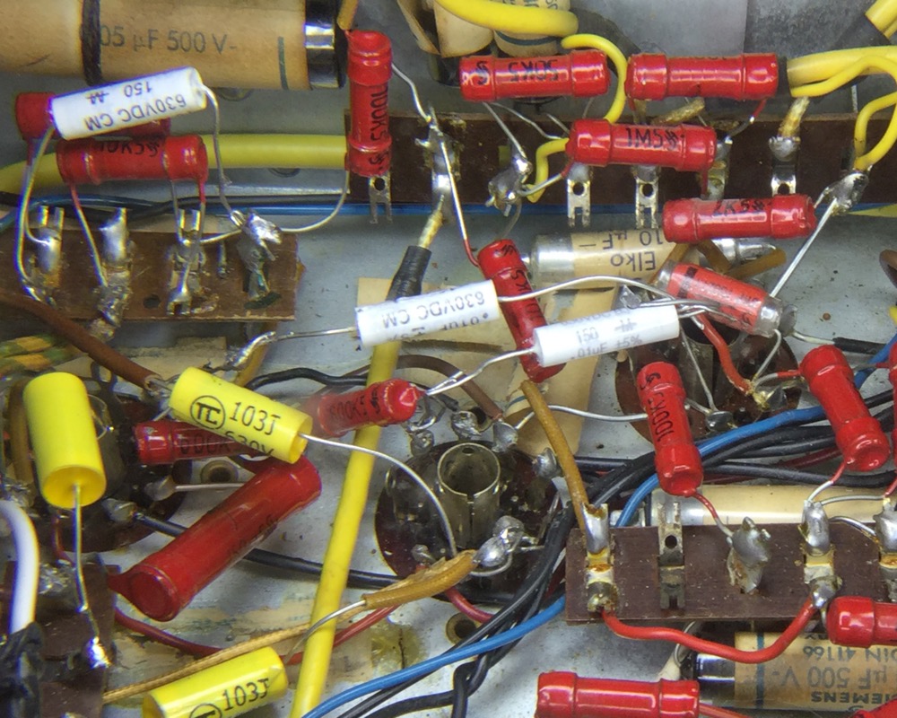Onkohan tässä käynyt niin, että nuo valkoiset kondensaattorit on kytketty ristiin putken ECC83:lla?