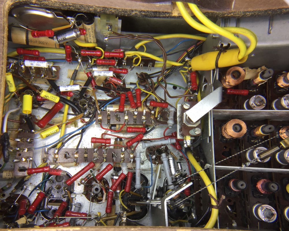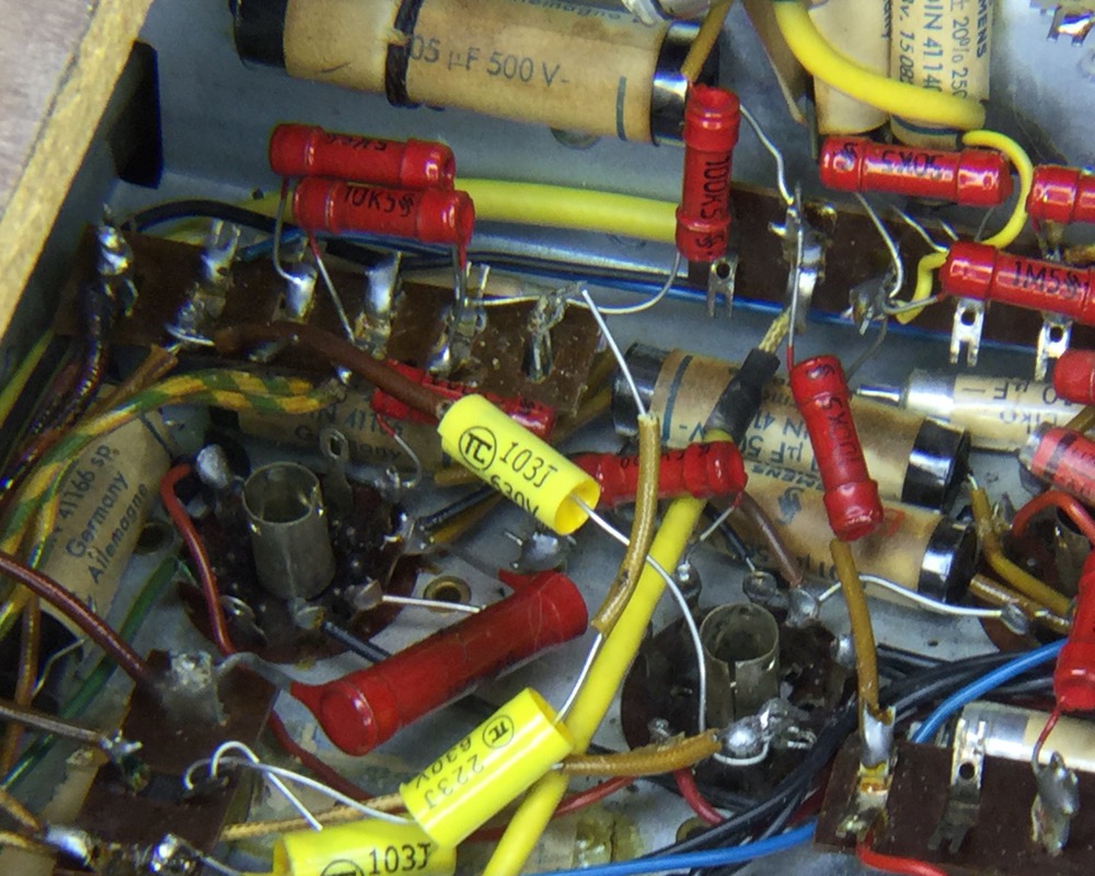 Tuli vähän epäselvästi kirjoiteltua, sori. Tarkoitin, että toivottavasti siihen bakeliittikantaan ei ole muodostunut hiilisiltaa. Siinä pitäisi olla 600KΩ kakkos ja kolmos navan välillä vastusta (600kΩ+150Ω). Tosin siinä välissä jännite on niin pieni ettei sähkö siitä välistä yleensä hyppää. Mutta molempien pääteputkien hilakonkat, 150Ω:n yhteinen katodivastus ja elko on syytä tarkistaa. Jos katodielkon joutuu vaihtamaan, saa se olla reilusti isompikin kuin 50µF.