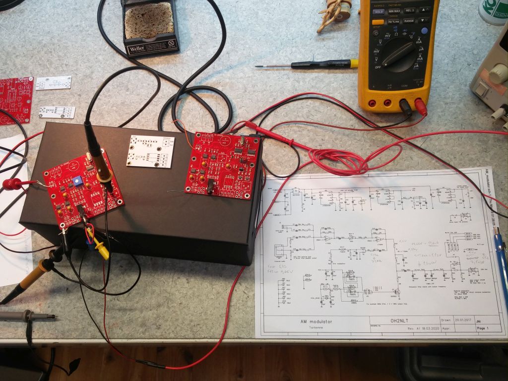 Sattumaa tai ei niin täälläkin on pöydällä modulaattorilevyt kasauksessa. Tein tuosta aikaisemmasta uuden version missä kortille on lisätty poweri, balun muuntaja ja paikka china tunerille. Näin systeemistä saa siistin paketin missä on ULA vastaanotin ja AM modulaattori.