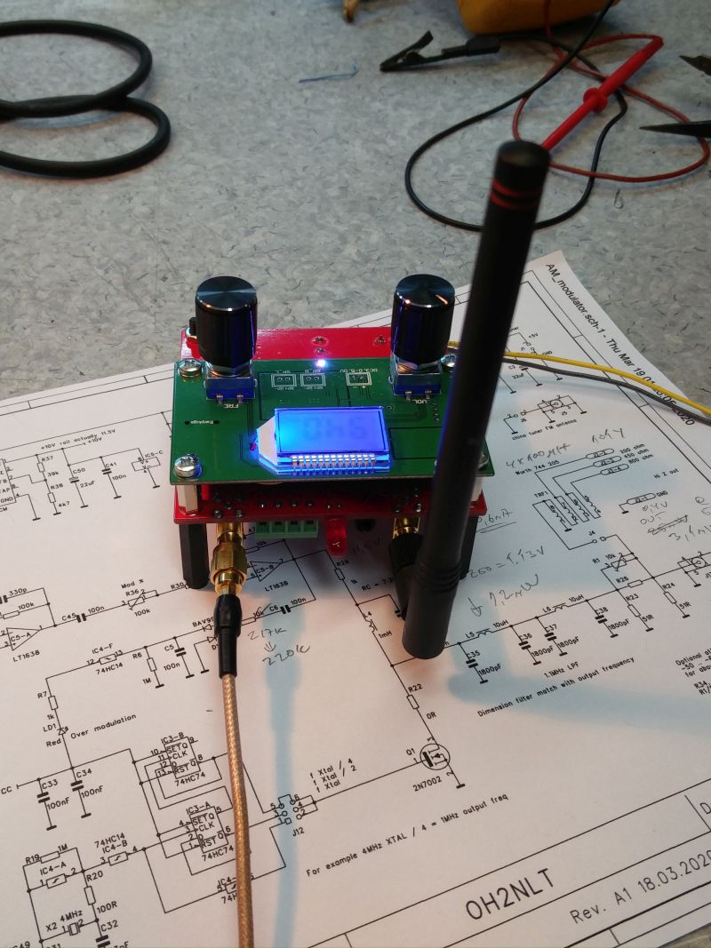Tein vielä version (ja testasin sen), jossa kideoskillaattorin sijaan modulaattorin kantoaalto muodostetaan VFO:lla, eli taajuus on säädettävissä.